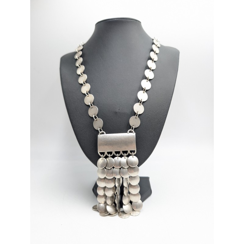 Collier Paco Rabanne Paris en métal couleur argentée composé de pastilles articulées et d’un pendentif en cascade. Bijou vintage iconique au design futuriste.