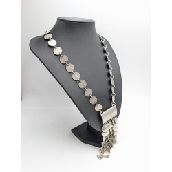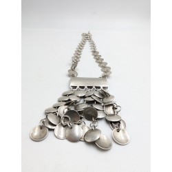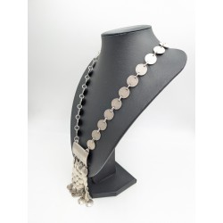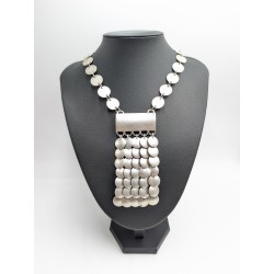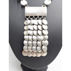 Le collier est composé d’une chaîne formée de disques métalliques couleur argentée reliés entre eux, menant à un large pendentif décoratif orné de multiples pastilles mobiles créant un bel effet de mouvement et de lumière.