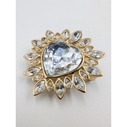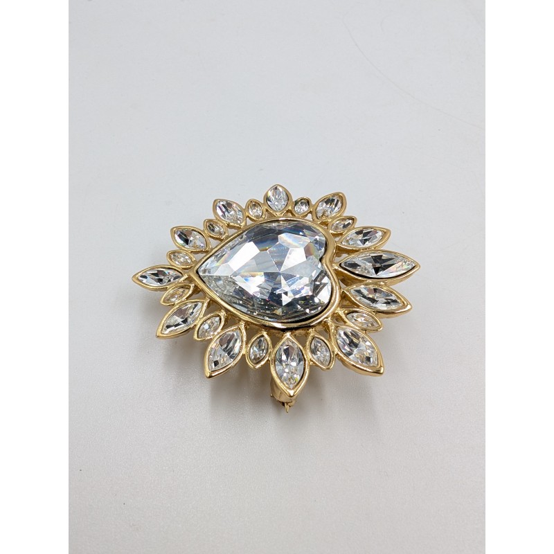 Superbe broche vintage signée Yves Saint Laurent, illustrant le style couture emblématique de la maison. Cette pièce se compose d’un élégant motif cœur orné d’un large cristal central facetté, entouré de cristaux navette disposés en halo rayonnant.
