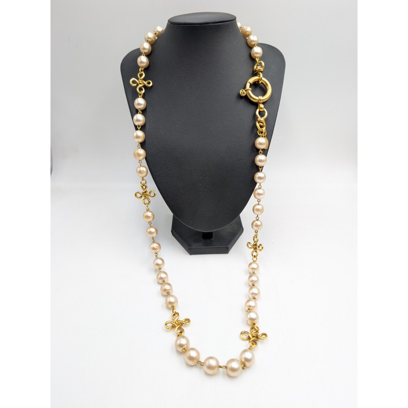 Authentique collier sautoir Chanel vintage issu de la collection 93P (Printemps 1993), fabriqué en France. Ce modèle emblématique associe de larges perles fantaisie nacrées à une monture en métal doré, ponctuée de motifs nœuds stylisés caractéristiques de la maison Chanel.