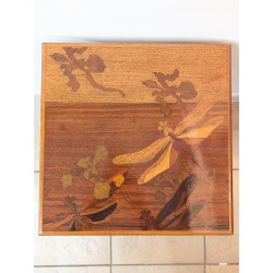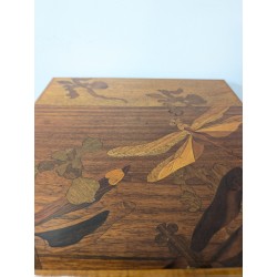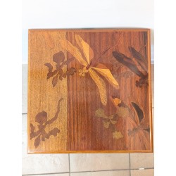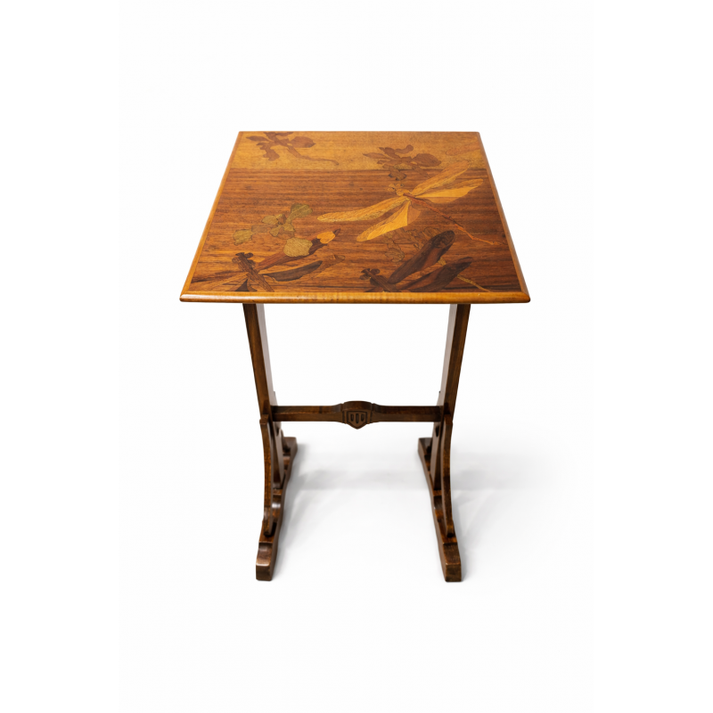 Élégant guéridon Art Nouveau signé Gallé, réalisé vers 1900. Le plateau carré (35 x 35 cm) présente un remarquable décor de marqueterie naturaliste figurant une libellule aux ailes déployées, entourée de feuillages stylisés, exécuté dans différentes essences de bois précieux aux tons contrastés.