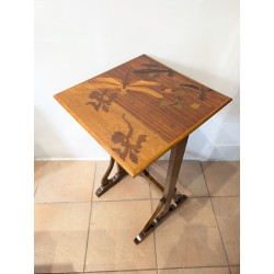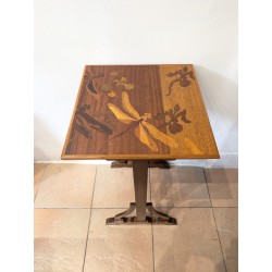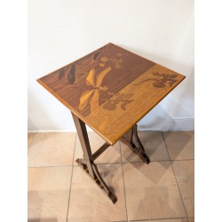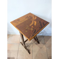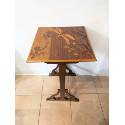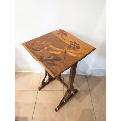 Guéridon Art Nouveau signé Gallé, vers 1900. Plateau carré 35 x 35 cm en marqueterie à décor de libellule, signature en placage incrusté. Hauteur 63 cm. Piètement ajouré, assemblages traditionnels. École de Nancy.