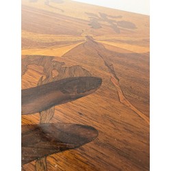 La signature “Gallé” est intégrée en placage incrusté au sein de l’aile de la libellule, ton sur ton, avec un veinage distinct confirmant son insertion d’origine dans la marqueterie. Elle présente une patine homogène avec l’ensemble du plateau.