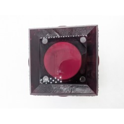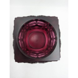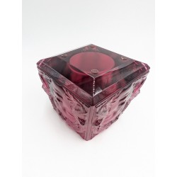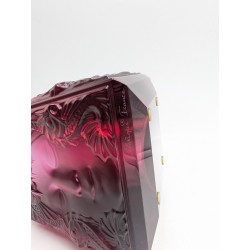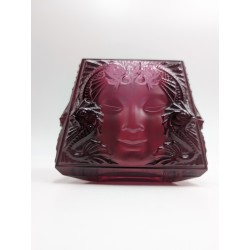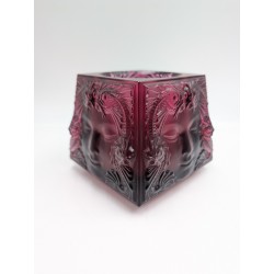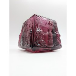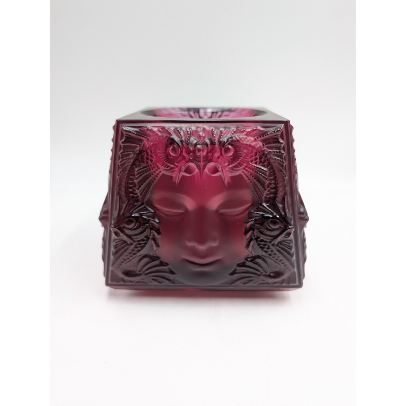 Réalisé en cristal moulé pressé, le photophore présente quatre visages féminins en relief, traités en finition satinée, contrastant avec les surfaces polies brillantes. La teinte rouge, plus confidentielle que le cristal incolore classique, confère à l’objet une présence visuelle forte et une profondeur lumineuse marquée.