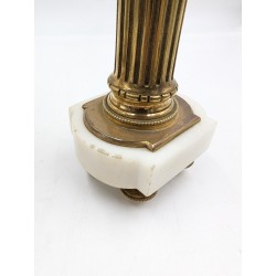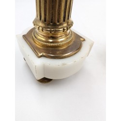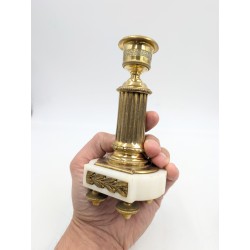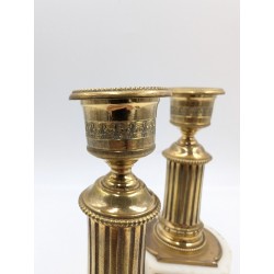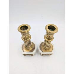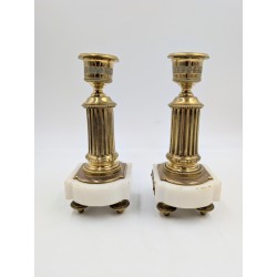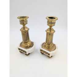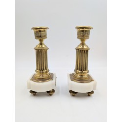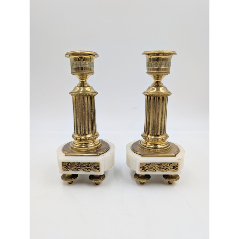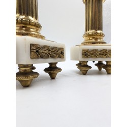 Paire de bougeoirs style Empire du XIXᵉ siècle en bronze doré et marbre blanc. Colonnes cannelées, décor de laurier, belle patine ancienne.