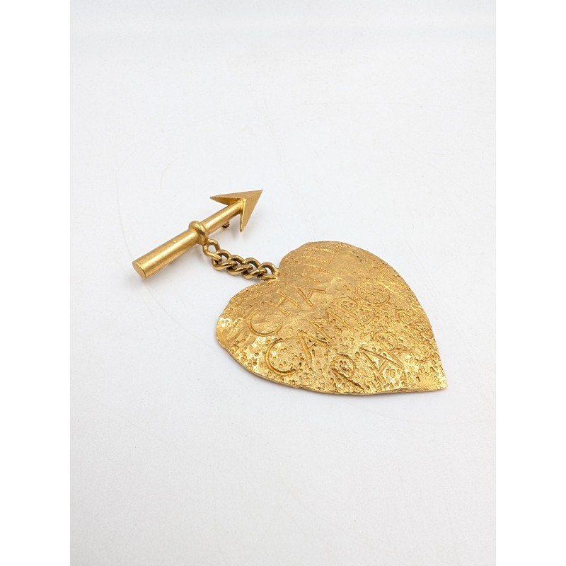 Broche Chanel vintage massive en métal doré, représentant un cœur texturé traversé par une flèche articulée. Le cœur est gravé “Chanel Cambon Paris”, une référence directe à l’adresse historique de la Maison. Au dos, une étoile est finement embossée, détail rare et recherché parmi les collectionneurs de pièces Chanel d’époque.