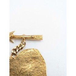 Cette broche présente un travail de métal doré typique des créations Chanel vintage : relief marqué, texture martelée et forme imposante. Elle se porte aussi bien sur une veste, un manteau ou un pull, et constitue un accessoire emblématique pour celles et ceux qui apprécient les bijoux couture audacieux.