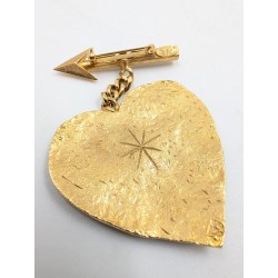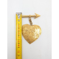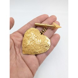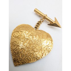Broche Chanel vintage en métal doré, en forme de cœur massif traversé d’une flèche articulée. Gravée “Chanel Cambon Paris” avec une étoile au dos, cette pièce décorative et rare est idéale pour les collectionneurs et pour l’achat/vente de bijoux Chanel vintage.